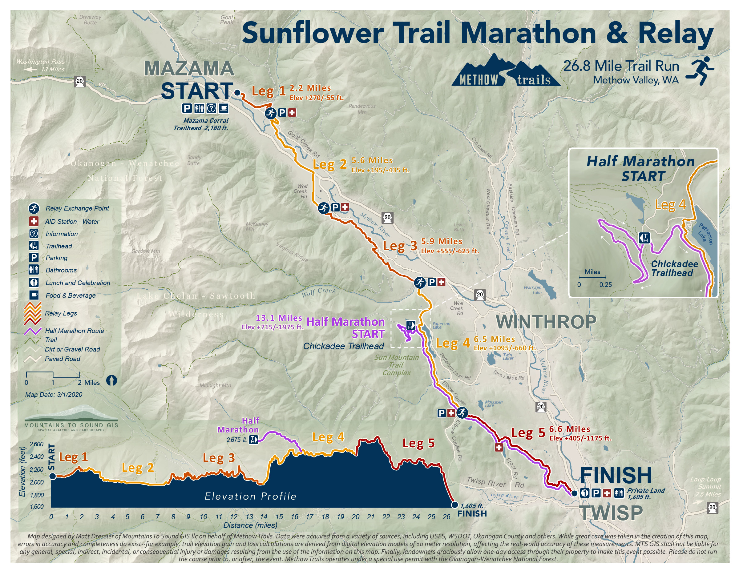 Join us April 25, 2026 for the 45th annual Sunflower Marathon, Half Marathon, and Relay! This unique course begins at 2180 feet elevation in Mazama and includes well marked deer trails, single track trails, and gravel roads. Stunning views of the Methow River, North Cascades and Chelan Sawtooths abound from flower cflower-carpetedarpeted meadows and fields. At two points, racers climb to 2600 feet. The finish is at about 1600 feet in Twisp. This course traverses private property that owners generously allow use for this one day only.