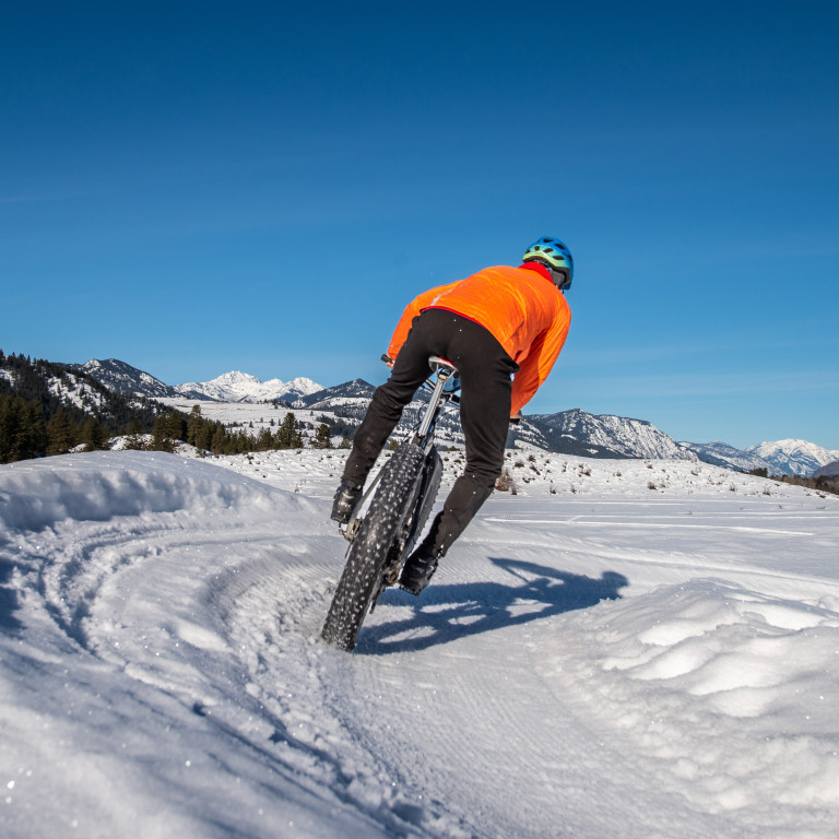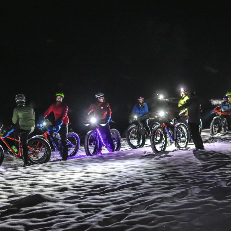 Fat bikes are specially-made bicycles that accommodate ultra-wide tires which can be run at very low pressure. The combination of very wide tires and less than ten pounds of pressure allows fat bikes to roll over soft, slippery surfaces like snow. Fat bikes are one of the fastest-growing segments of the bicycle industry, simply bundle up like you would for skiing and get out and ride!